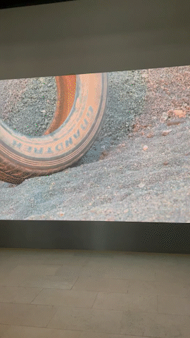 On the screen a kid was pushing a big truck wheel up a hill. The hill was black and sandy-like, and the black wheel seemed bulkier than the colourful little kiddo. The kid's game consisted in pushing the wheel to the top of the hill, to then pop into the wheel and roll down the hill. On repeat until he got tired, I guess. He pushed the wheel to the top once more and simply pushed the wheel down. This is how the short movie ends. And the noise ends as well.