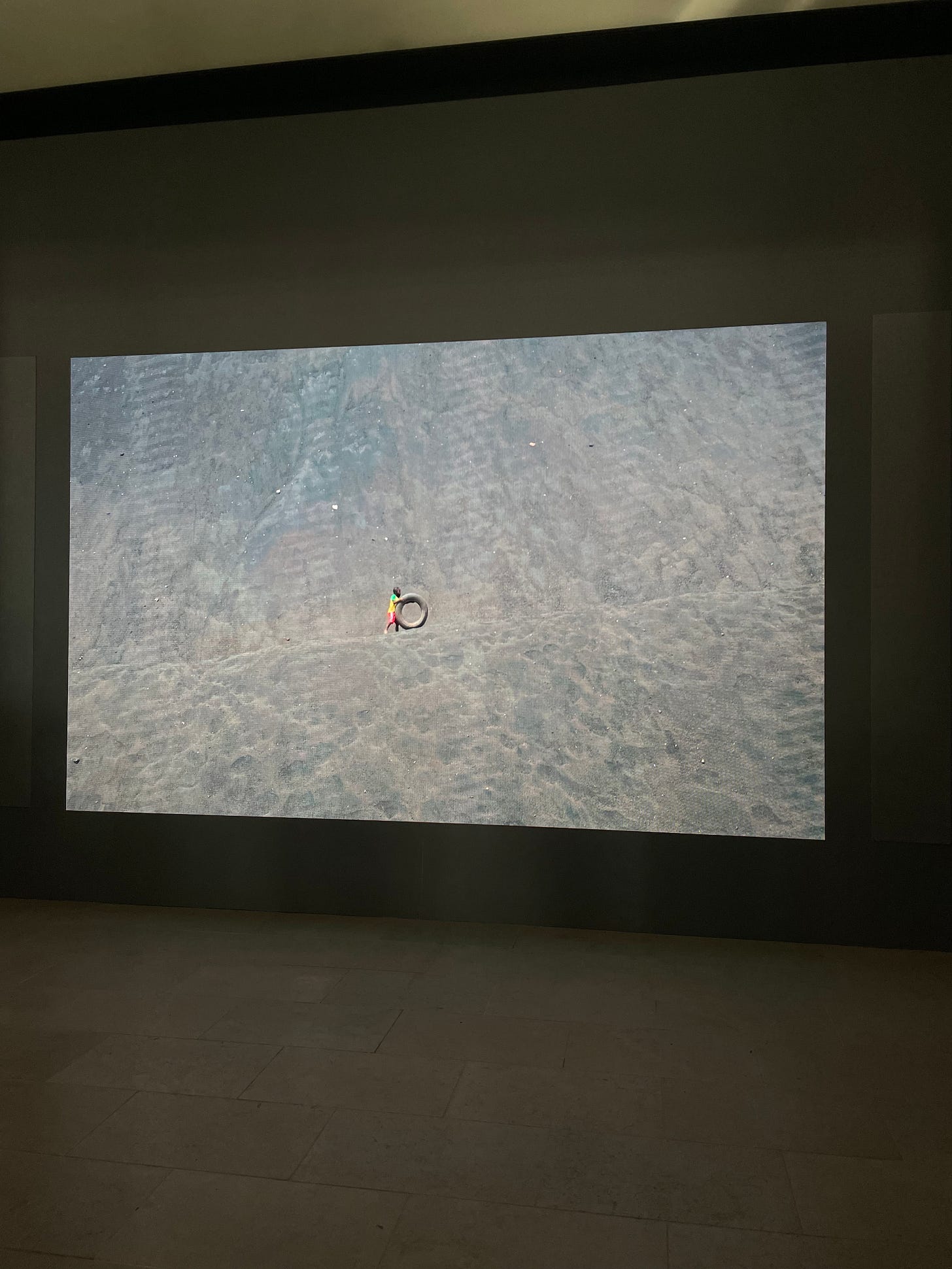Sur l'écran, un enfant poussait une grosse roue de camion sur une colline. La colline était noire et sablonneuse, et la roue noire semblait plus volumineuse que le petit enfant coloré. Le jeu du gamin consistait à pousser la roue jusqu'au sommet de la colline, pour ensuite se nicher dans la roue et dévaler la colline. Et cela en boucle jusqu'à ce qu'il soit fatigué, je suppose. Il a poussé la roue jusqu'au sommet une fois de plus et a simplement poussé la roue vers le bas. C'est ainsi que se termine le petit film. Et le bruit se termine aussi.